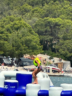 After that, we headed for a morning swim with both the water park and the paddleboard in use. Even Grandfather felt like taking a turn today. He started in a somewhat peculiar backward style, but eventually got up on his knees and maneuvered around nicely. At 2 PM, we had a reservation at a slightly fancier restaurant in Morter, where we had really delicious food at 'Fine Food Morter' (we found the name amusing and thought it might be a tourist trap, but it was truly good).