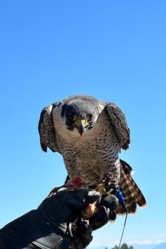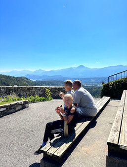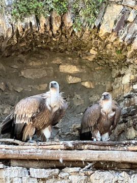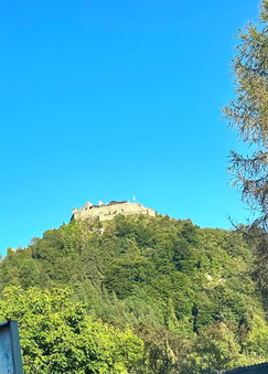 Afterward, we went up to the castle with the birds. You could see some of them in their cages on the way up, and it was first-come-first-served for the seats. However, the sun was scorching, and we hadn't brought enough to drink, so we went back for a couple of liters of fluids before the show started at 1 PM. Here, we saw different types of birds of prey flying over our heads while catching food in various ways. The golden eagle impressed us the most, and the peregrine falcon was the biggest disappointment because it was so small (we've read books about it as it's the fastest bird in the world and can fly up to 400 km/h!). All in all, a great show in incredibly beautiful surroundings in an old castle on top of a small mountain.