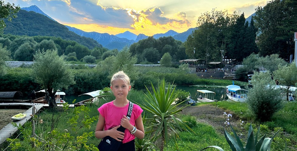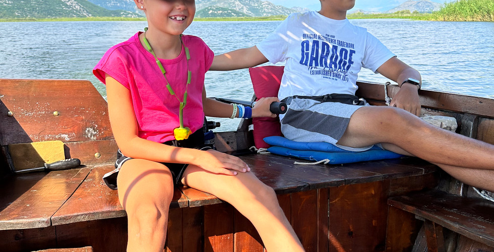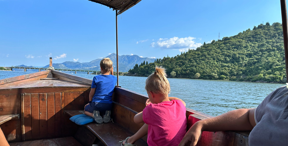 Despite a moment of hesitation, we had a fantastic trip with 'André', who could share a little in English about what we were seeing along the way and was friendly to the kids. Naja made a necklace from a water lily, and they both got to help steer the little boat. Wonderful. The lake is shared between Montenegro and Albania, but our trip stayed on the Montenegrin side, where we could also look towards the Albanian mountains. All in all, incredibly beautiful, and even the kids were quite calm, even though the trip took several hours.