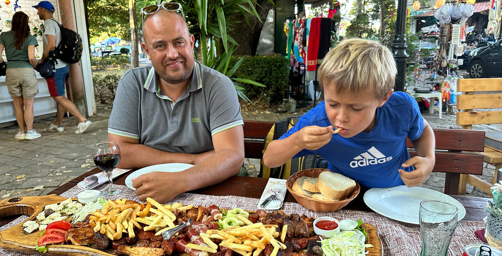Efter den dejlige sejltur gik vi en lille tur og kiggede os omkring og blev enige om at blive og spise aftensmad på en af restauranterne før vi kørte retur. Vi kastede os ud i en lokal familiestørelse grill-platte, hvilket måske ikke var det bedste valg på bagkant af rumlende maver! Men det var godt at smage noget andet og Georg havde fået nået sit mit om pizza eller pasta hver dag i 4 uger!
