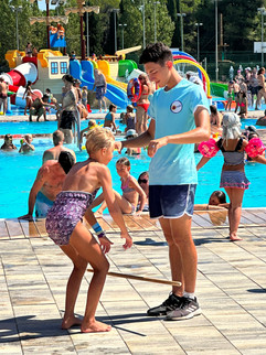 Everyone was a bit tired after yesterday's program, so it was past 10 AM before we gathered at the last pool on the site. They are all quite similar, but this one has a shallow area where kids can play with water and try the small slides without needing an adult. If you don't get there when the areas open, it's impossible to get a sunbed or any kind of shaded spot, so at 34 degrees Celsius, you bathe and leave when you're done! We played for a couple of hours, including a slightly different morning water aerobics session, and then we found our hiding places during the midday hours; we sat at a 'bar,' and the others took a nap in the apartment.